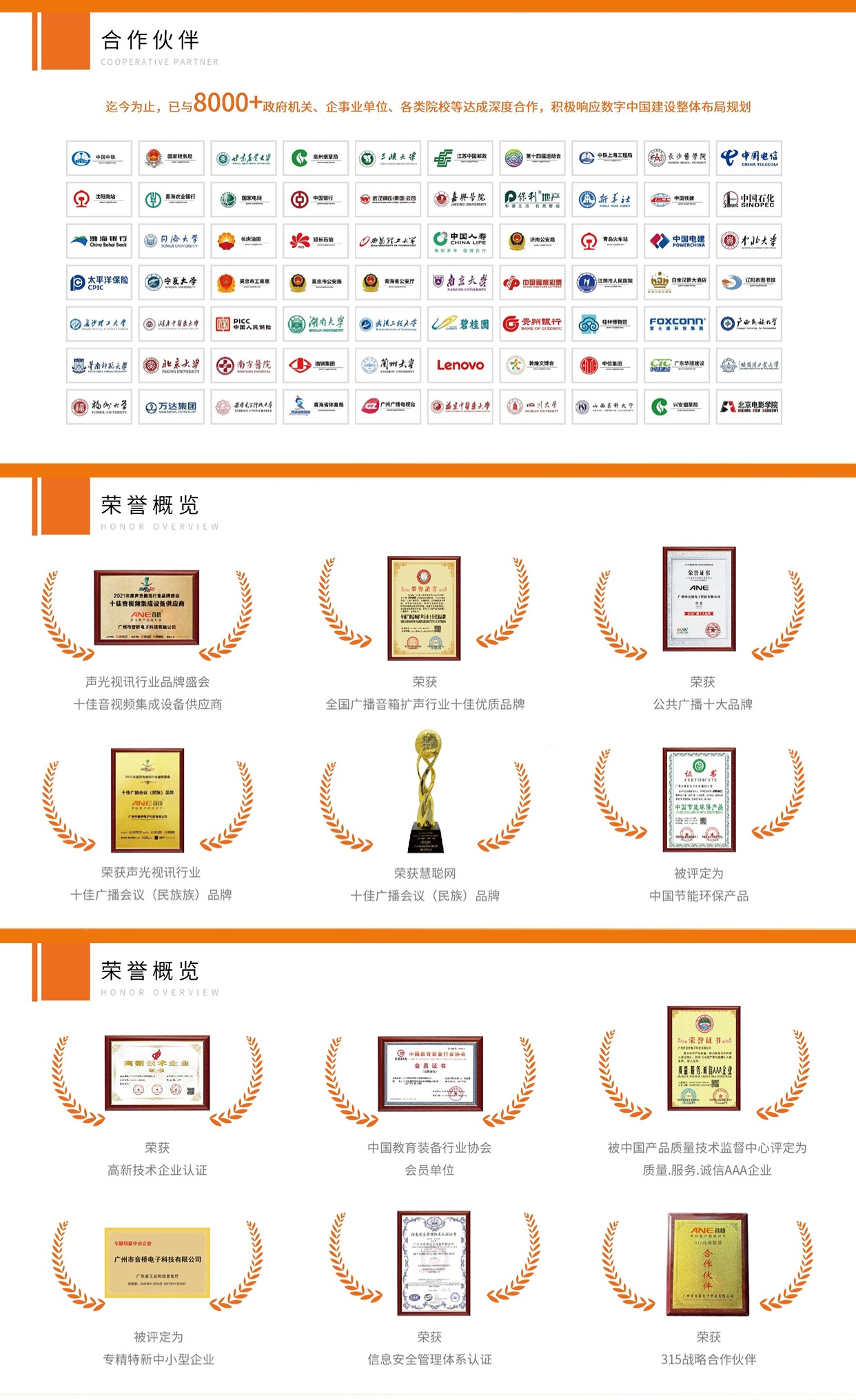 目前,集团以广州营销总部沉浸式场景体验展厅为中枢,通过全国6大区域分公司及省级办事处落地化服务布局,构建起覆盖技术攻关、场景验证到生态输出的全链路服务体系。公司旗下ANE品牌连续多年斩获"十佳音视频系统解决方案品牌"、"十佳广播会议民族品牌”、"十佳专业扩声民族品牌”、"中国演艺设备技术协会金奖”等30余项行业殊荣,公司参与制定多项音视频行业技术标准。